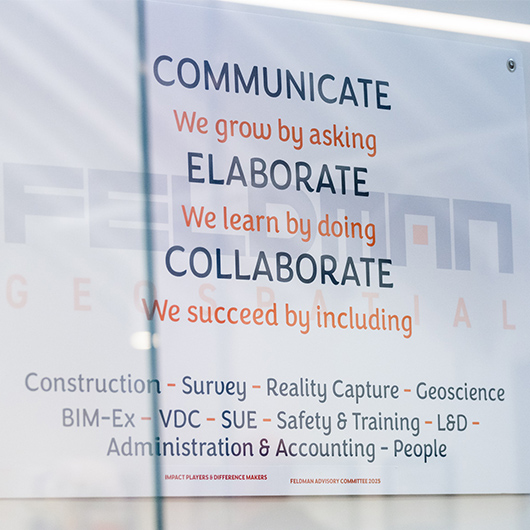 Those three words define our vision, our North Star. They form the foundation for our culture at Feldman Geospatial. We continually strive to elevate our team members and our clients through the value we create every day. We work as one, sharing our knowledge and experience to achieve great outcomes. And we celebrate the talent, dedication, and drive our people bring to every project.